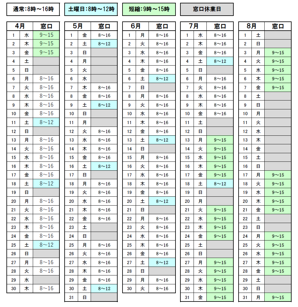 | 窓口短縮日(緑色) | 9:00 ~ 15:00 |