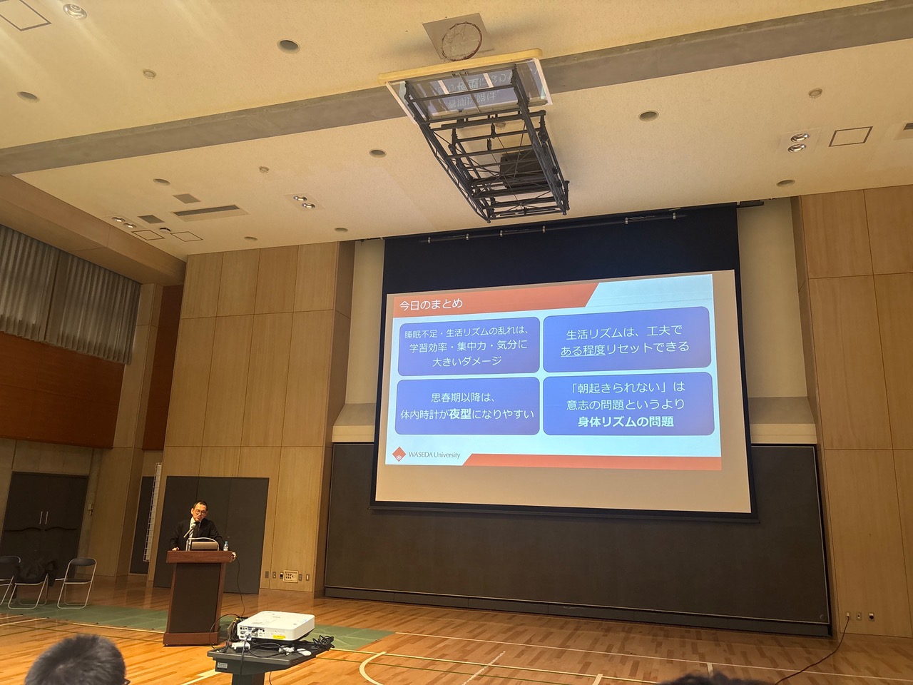講演の前半では、睡眠が記憶の定着や学習効率の向上に大きく関わっていることが説明されました。十分な睡眠をとることで勉強や運動の成果が高まることが紹介され、改めて睡眠の質と量の大切さを実感しました。> 後半は思春期以降陥りがちな夜型の生活、「朝起きられない」問題に関する内容でした。その中でソーシャル・ジェットラグという概念が紹介されました。夜型が強いほど、体内時計に従った睡眠時間帯と、社会的なスケジュールに従った睡眠時間帯とのズレが大きくなりがちで、日中の眠気が強くなってしまう、ということです。朝起きられないことはこのような身体リズムの問題であるのですが、身体リズムはある程度は修正できるとのことで、その改善の方法について考えることができました。