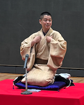 トリは笹丸さん。昨年 11 月、生徒にインプロ(即興演劇)を教えてくれました。落語に留まらない多才なパフォーマーです。マクラは学校寄席での子供の無邪気な質問ネタで生徒を惹きつけると、メイドカフェでの「面白くな〜れ❤️」で悶絶させ、「熊の皮」に入ります。妻にこき使われる夫が、赤飯のお礼を言いに行かされて失敗するという噺。艶やかで憎めない鬼嫁と尻に敷かれる甚兵衛さんの哀愁溢れる姿という描き方が秀逸。お医者の先生との頓珍漢なやりとりではやっぱり大爆笑。「尻に敷く?そうだ女房がよろしくと言っていました」という、これも「考え落ち」のサゲですが、こちらは分かった感じの笑いでした。センスいいぞ! チャイムが鳴る30秒前というプロならではの時間配分もお見事でした。