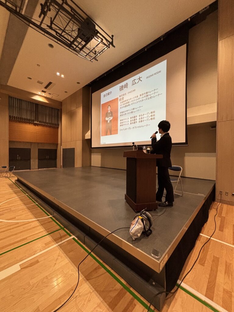 講師の磯﨑広大先生(アスレチックトレーナー)は、車椅子テニスや知的障がいバスケットボールなど、様々なパラスポーツのトレーナーとして活躍なさっています。まず、パラスポーツの魅力をご紹介いただきました。ブラインドサッカーの熱量、車椅子ラグビーの激しさ、車椅子テニスの競技レベルの高さなど、動画を交えた紹介に、生徒たちから感嘆の声が上がりました。次に、トレーナーとしての経験から感じたことをお話しいただきました。一口にパラスポーツと言っても、競技の違いはもちろん、障がいの特性にも様々なものがあります。個々の選手の置かれた状況はそれぞれ異なっており、だからこそ各選手に合わせたサポートが必要だと教えていただきました。