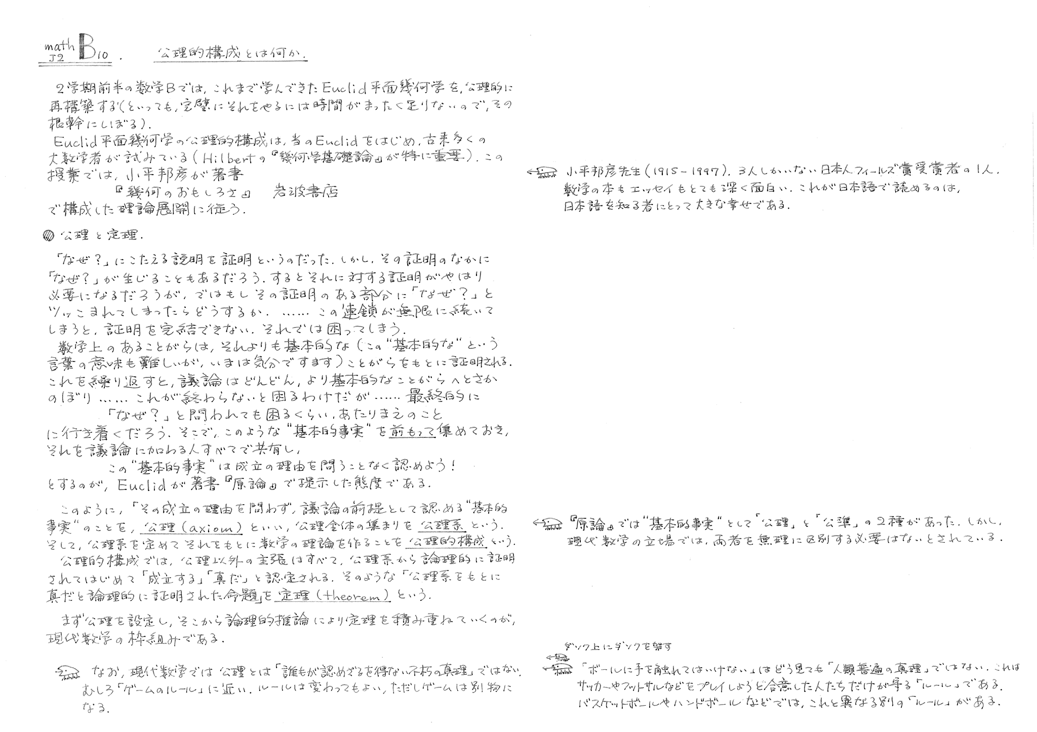 そのこたえは驚くほど同じで、この「公理によって数学の基盤を作る」という考え方や、「公理的構成(公理を用いた数学の理論の構築)」に関する授業だったのです。