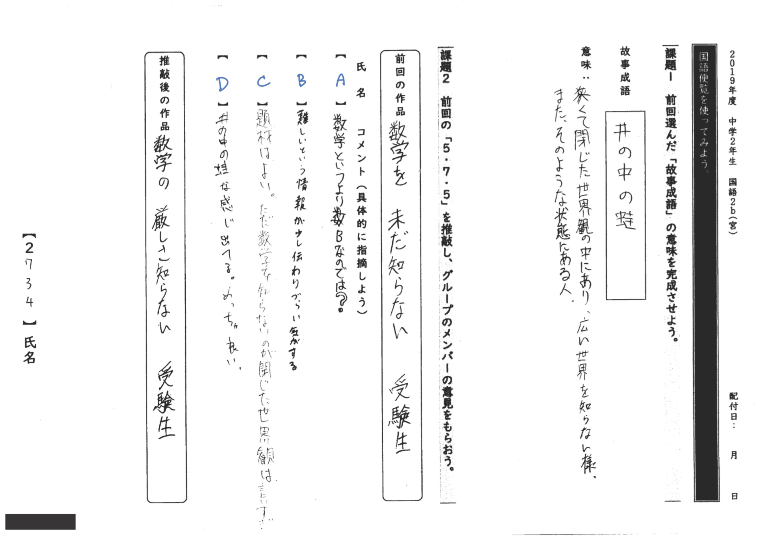 中学2年の3学期には、「故事成語を五七五で表す」という授業をやります。生徒たちは故事成語の意味を調べ、まずはその内容を五七五で表します。次にそれをグループで読み合って、メンバーからコメントをもらう。最後にコメントをふまえて、作品として仕上げます。