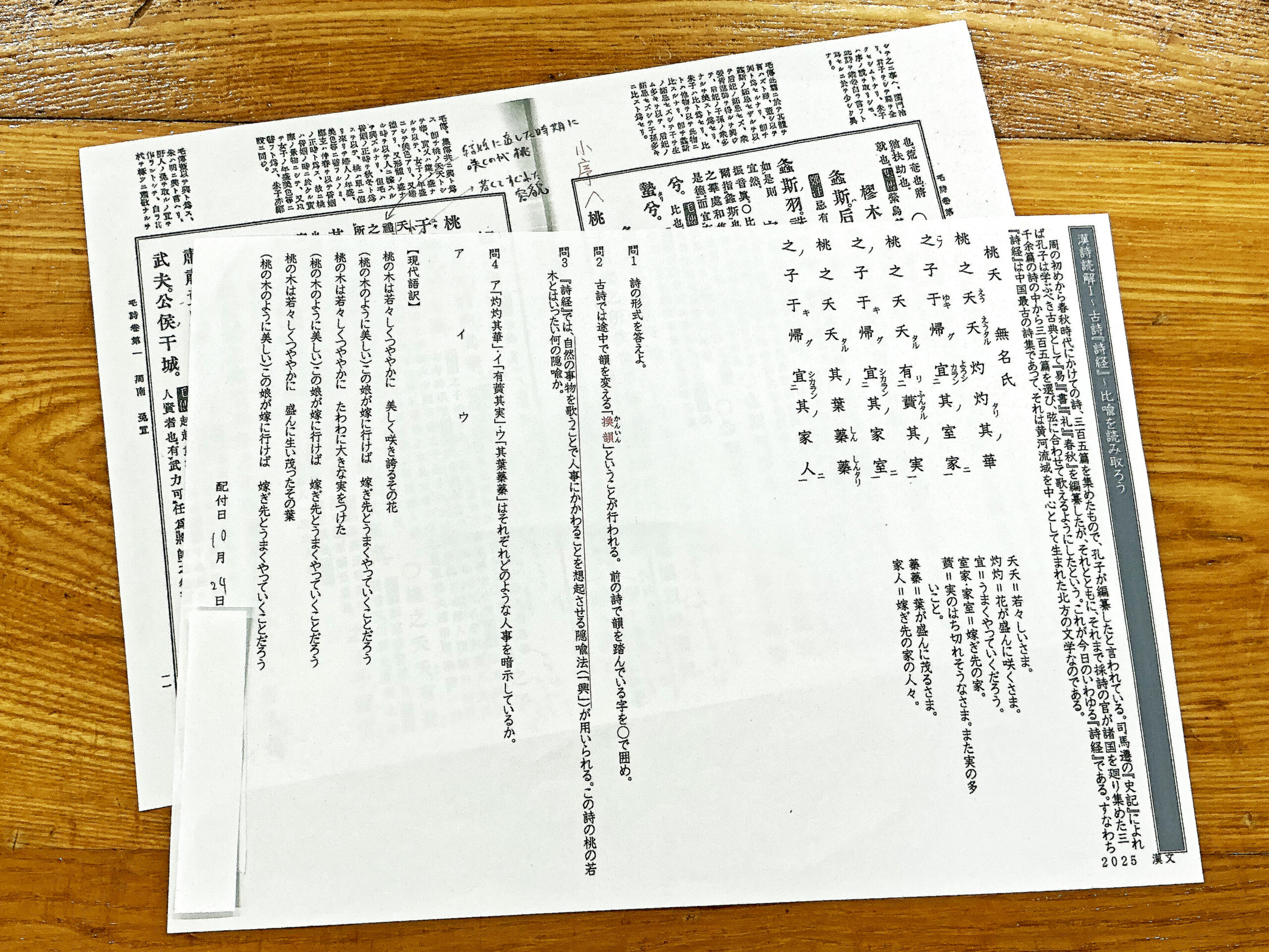 中国最古の詩集『詩経』にある「桃之夭夭」の教材プリント。リンクでは生徒が書き込んだプリントや古い注釈の原文も紹介する。
