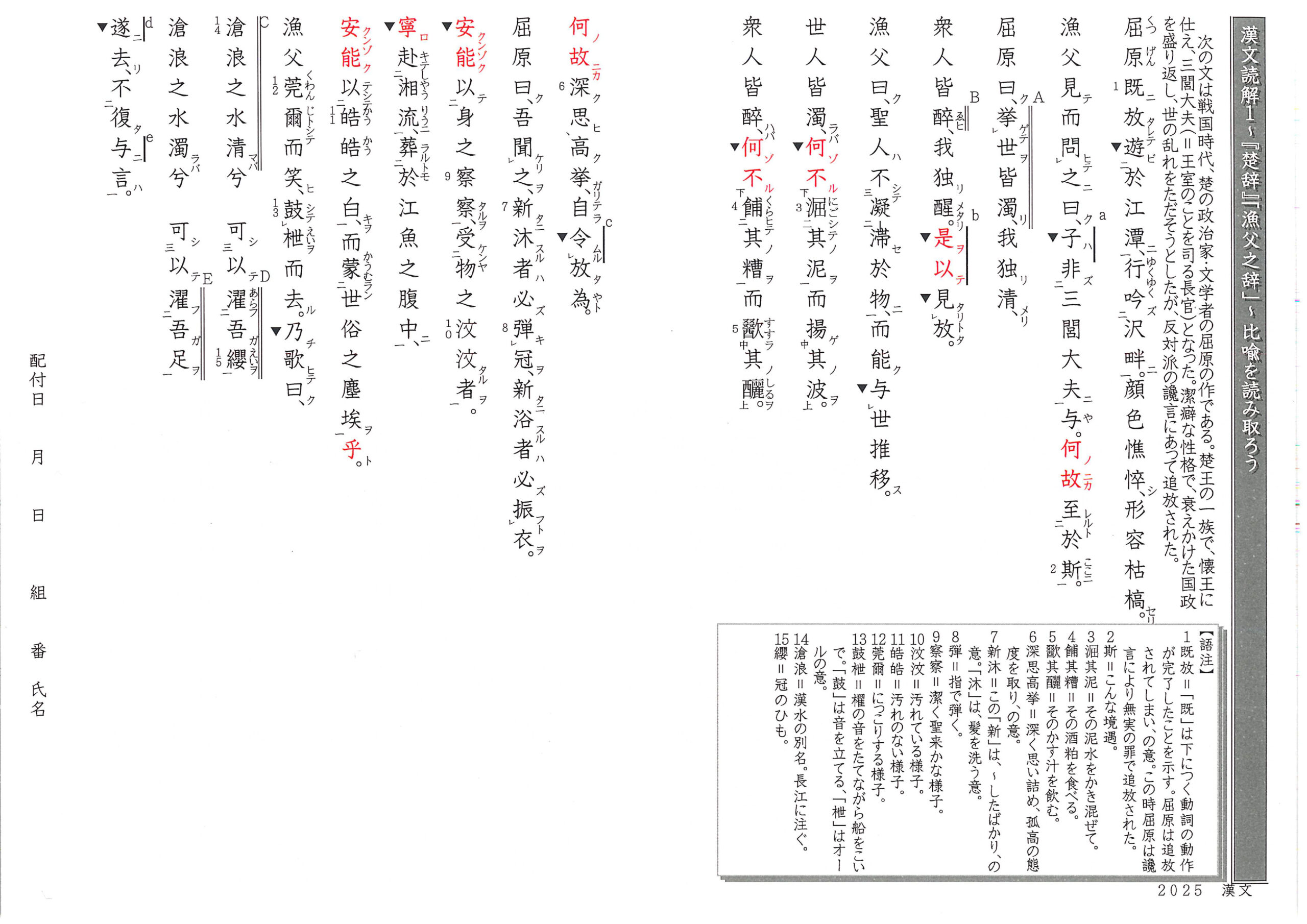 「漁父の辞」をテーマにした問題つくりの教材プリント。リンクでは、生徒の作成例を紹介。
